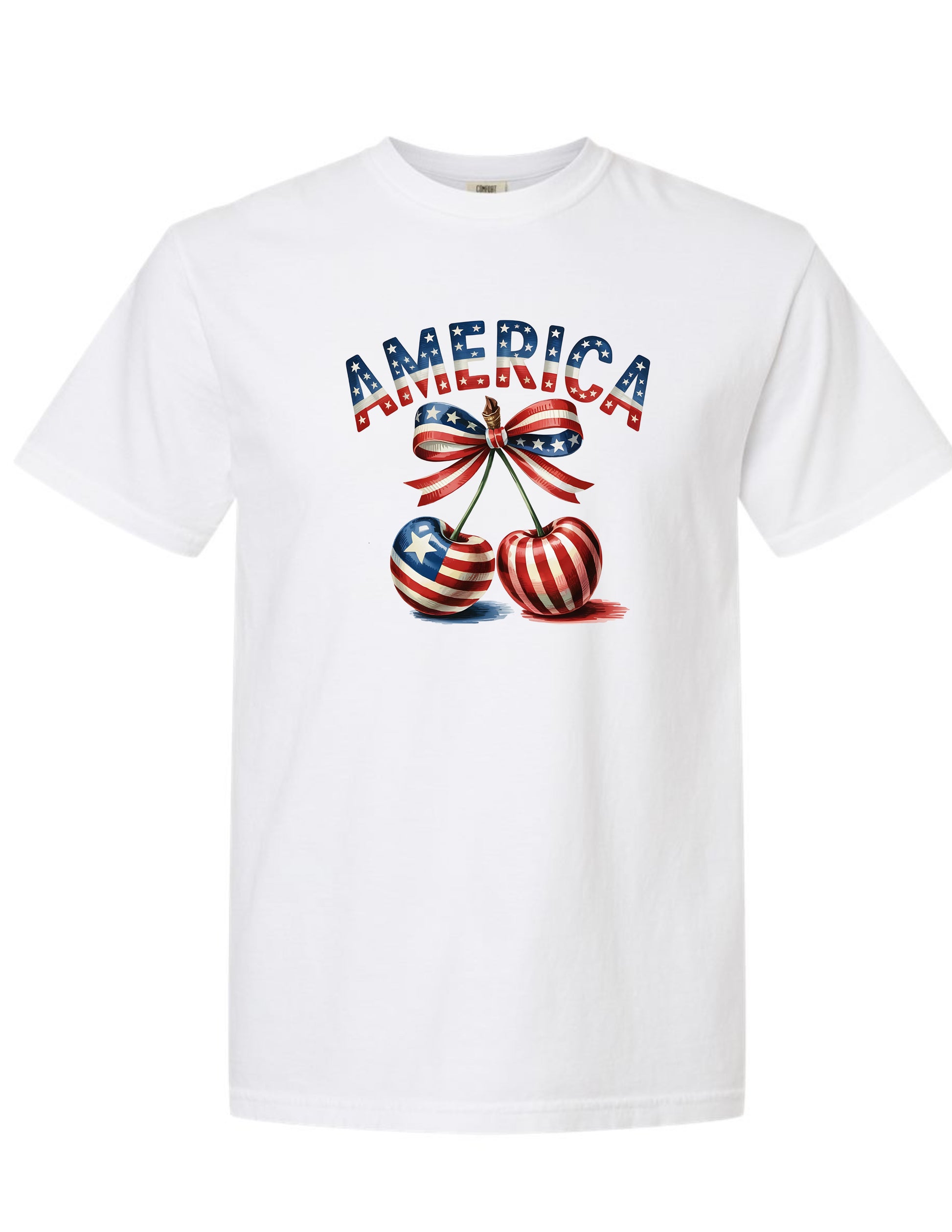 Stay cute and patriotic in this American Cherry Bow with vintage script and heart details. It’s perfect for Memorial Day brunch or the 4th of July parade.