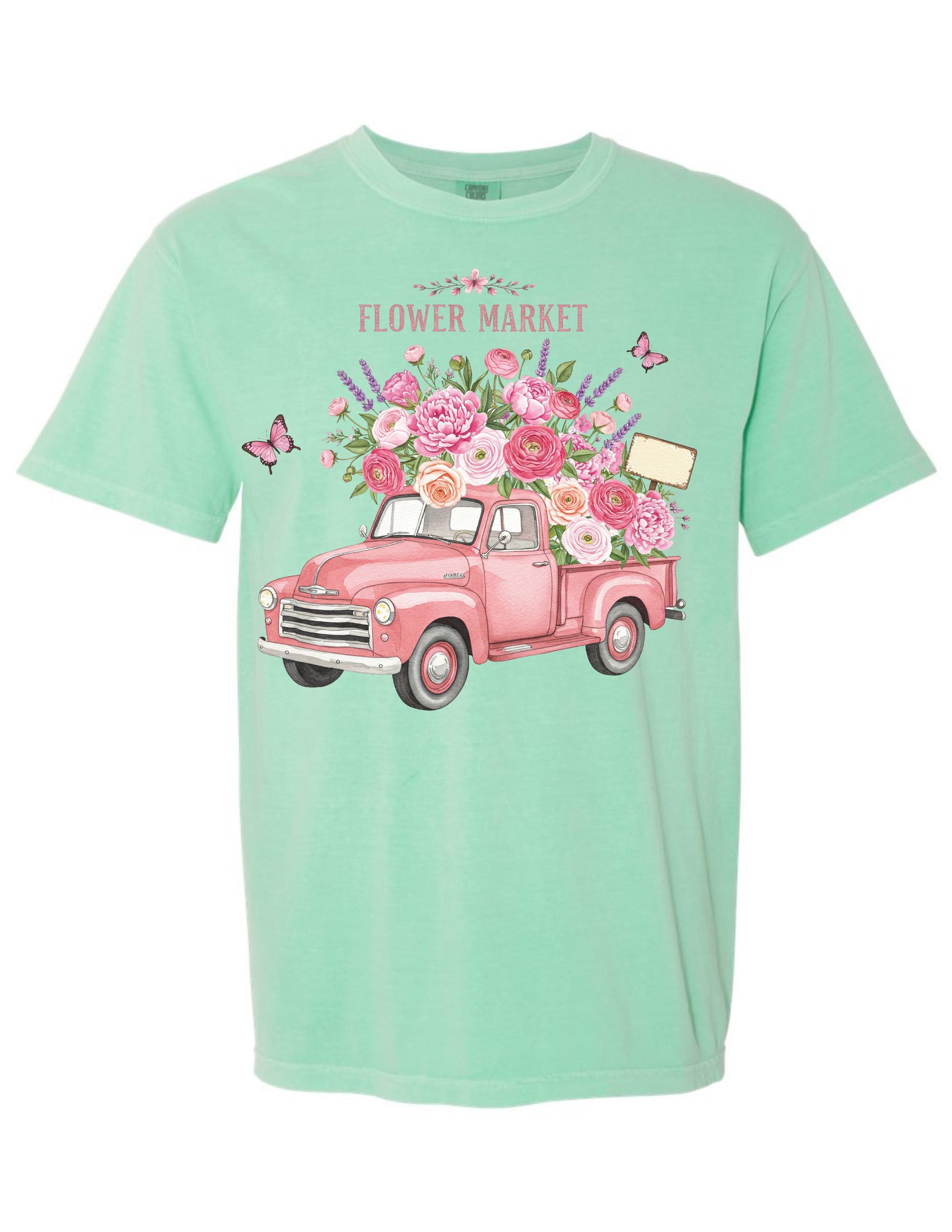 Celebrate the charm of the Flower Market with this adorable tee featuring a Vintage Pink Pickup Truck overflowing with vibrant blooms. Perfect for flower lovers and market days, this shirt brings a fresh, floral vibe to your casual wardrobe. Soft, stylish, and full of countryside charm!