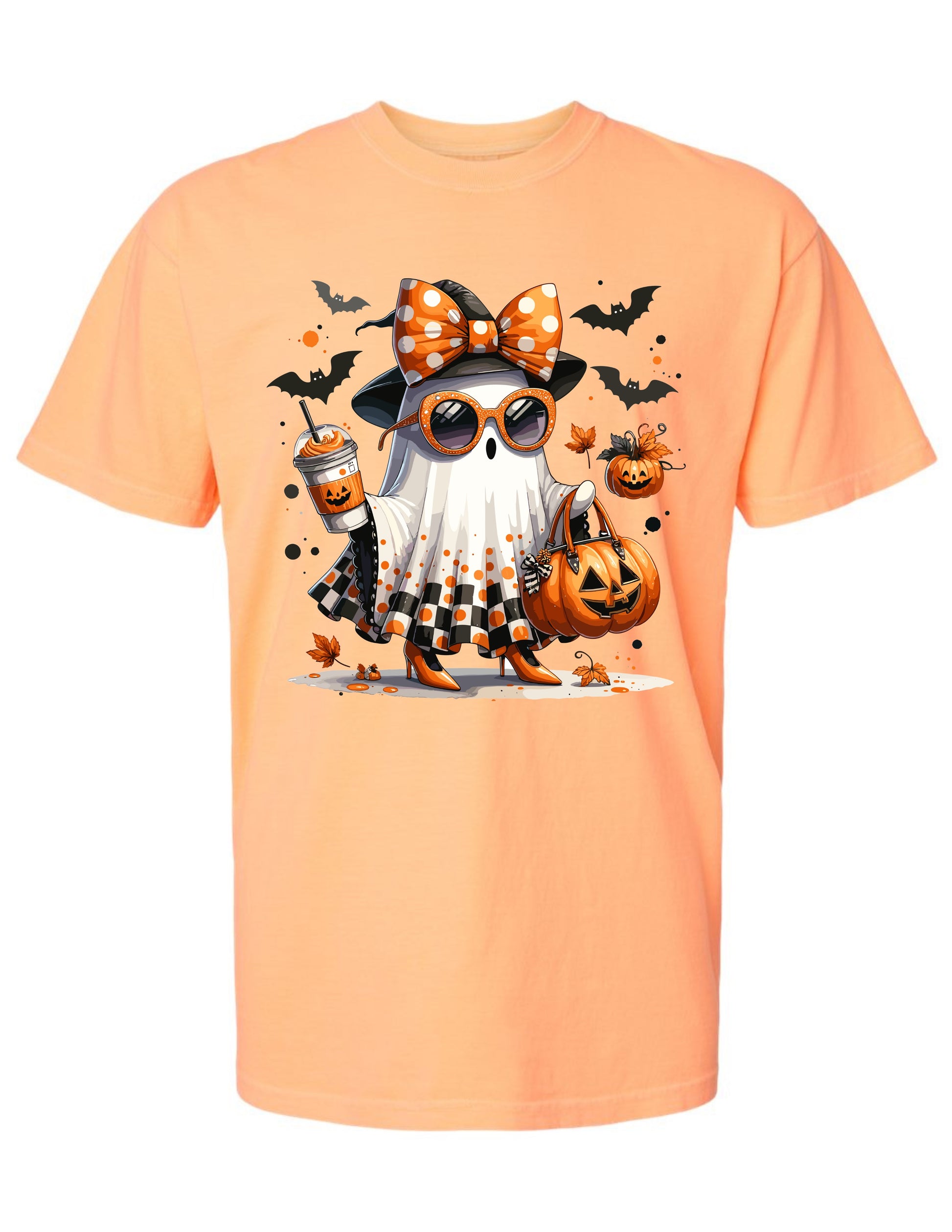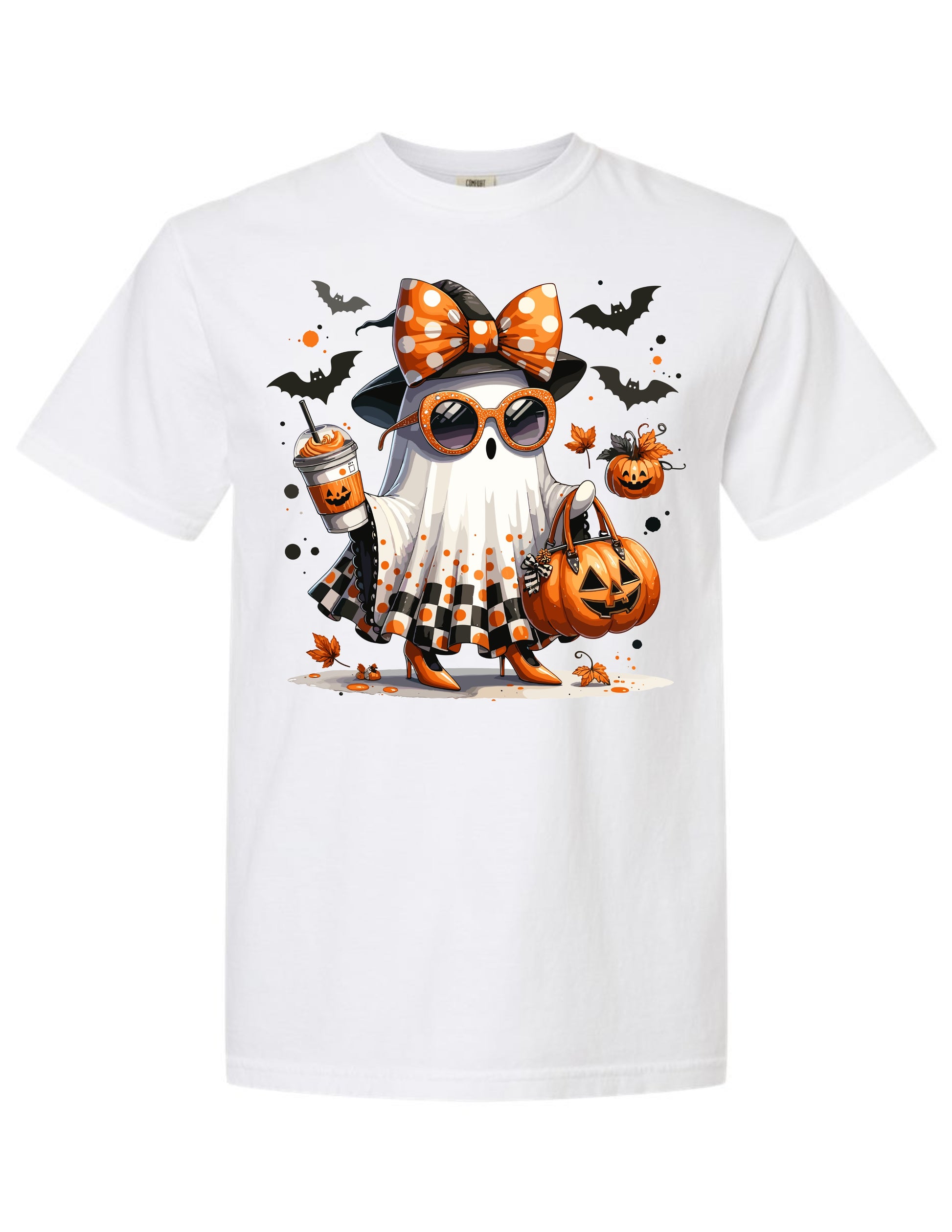 Add cozy autumn charm to your look with our Polka Dot Boo Tee! This stylish ghost, dressed in orange and white with a pumpkin purse and latte in hand, brings all the seasonal vibes. Perfect for pumpkin patch trips, coffee runs, or layering under your favorite fall flannel.
